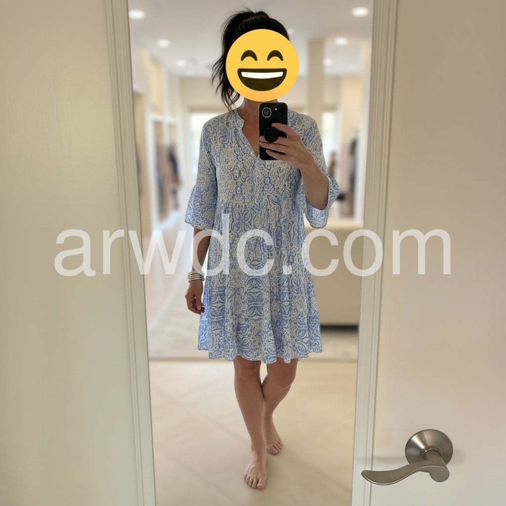 Weathered Blue White Vintage Print Half Sleeve Mini Dress