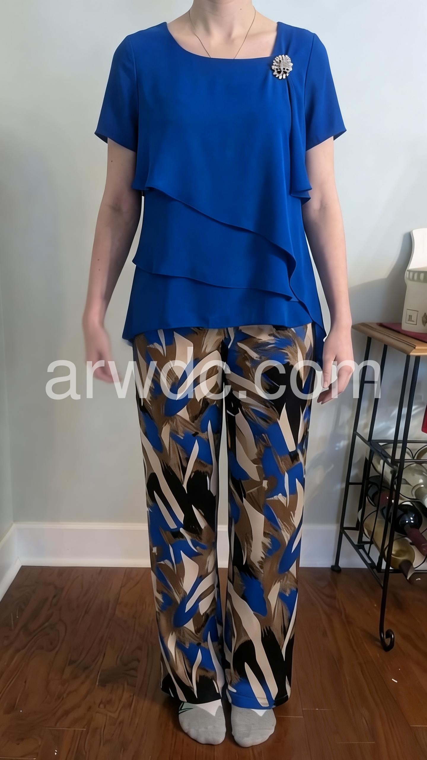 I am thrilled with this purchase! The colors in the pants match perfectly with the bright blue top. It looks like a very expensive boutique outfit but at a fraction of the cost. It packed well for my vacation with barely any wrinkles.