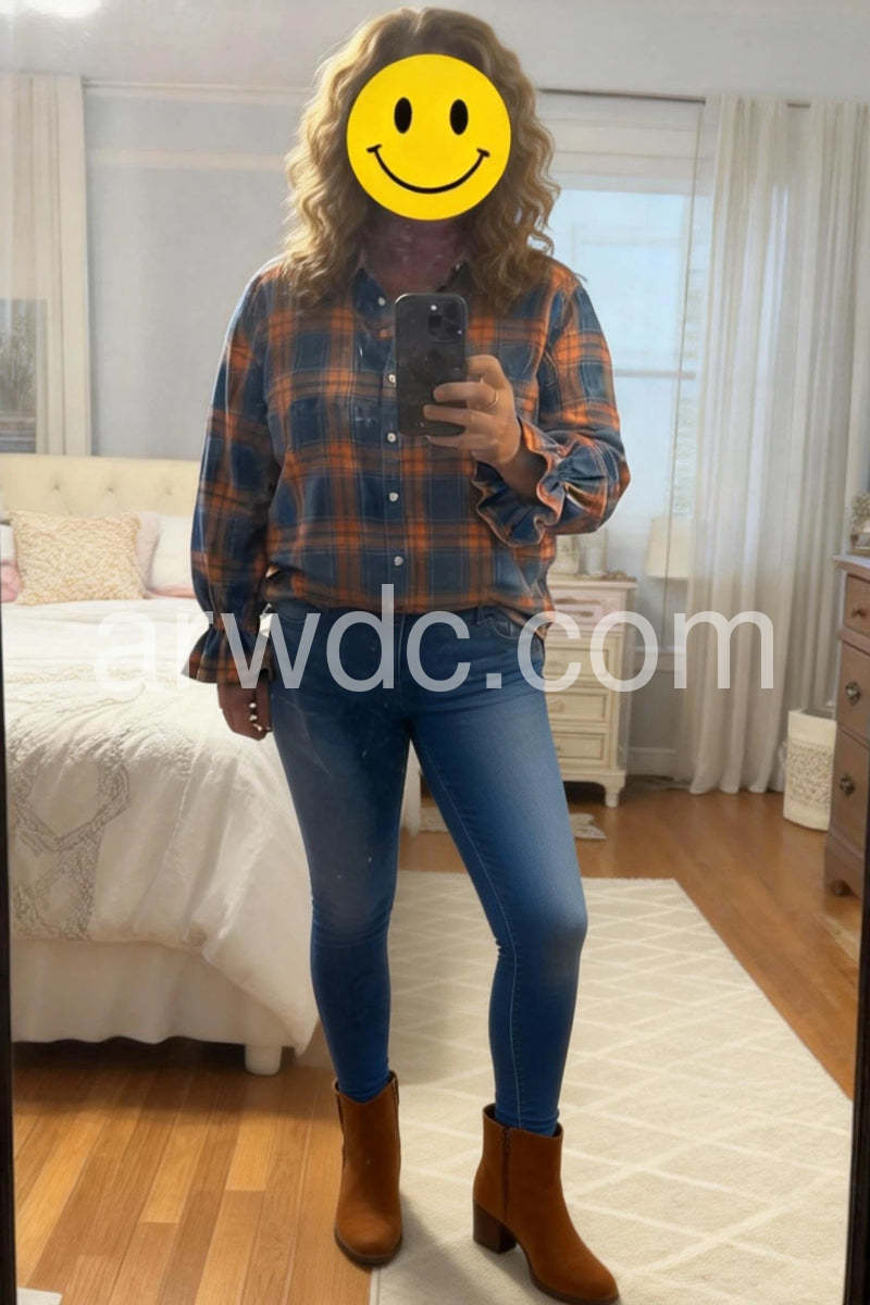 Blue Check Button Down Shirt with Ruffle Cuff Sleeves