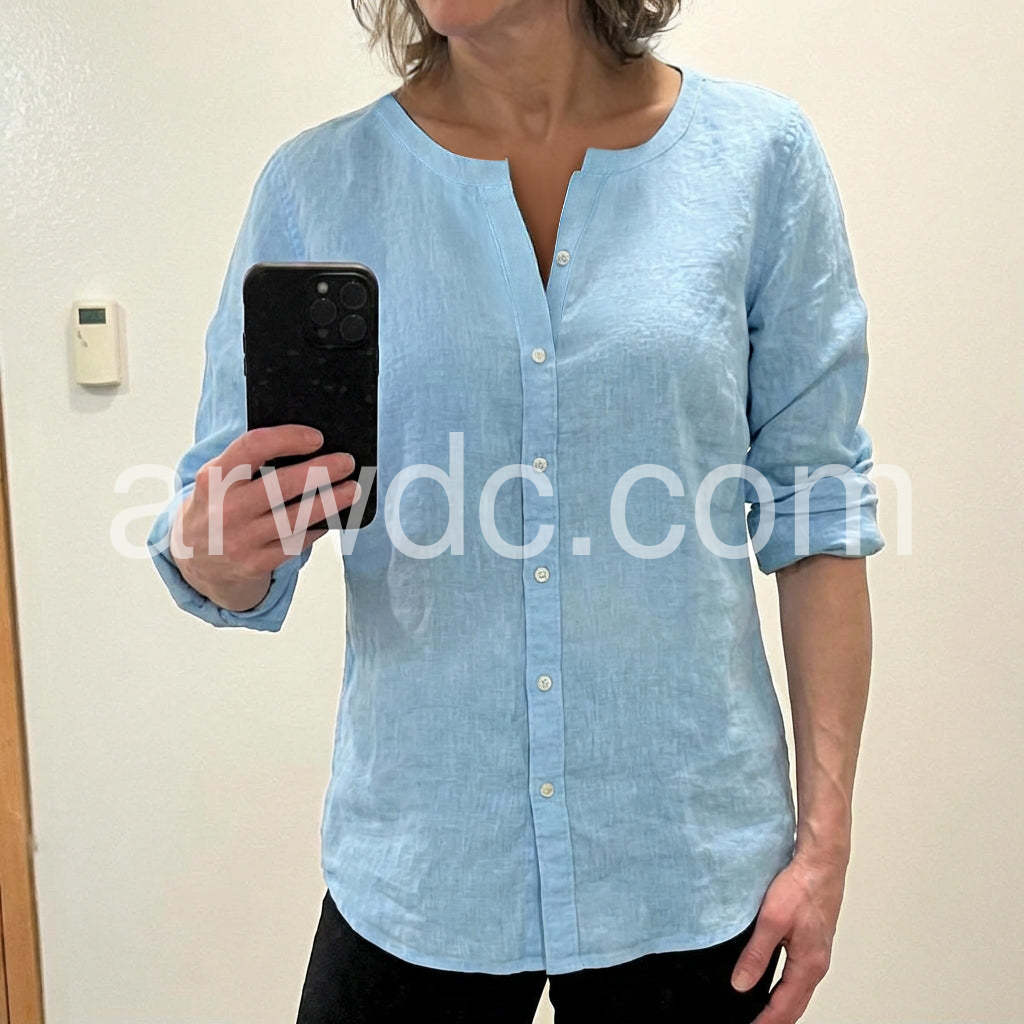 Elevate your everyday style with this Soft Blue Linen-Blend Button Up Blouse, a breath of fresh air for warm-weather wardrobes. Crafted from lightweight, breathable fabric with a subtle linen texture, this blouse offers a relaxed yet polished silhouette that’s perfect for both casual and semi-formal settings. Featuring a clean V-neckline with a split front detail, it adds a touch of modern elegance, while the full-length sleeves can be rolled up for a laid-back, effortless look. The soft sky-blue hue exudes calm sophistication, making it easy to pair with jeans, trousers, or skirts. Whether you're heading to the office, meeting friends for coffee, or enjoying a weekend stroll, this versatile top brings comfort and style in one. Inspired by the minimalist, curated fashion found on Lulus.com, it’s ideal for those who love timeless pieces with a hint of coastal charm. A wardrobe staple that combines simplicity, comfort, and understated beauty—perfect for women who appreciate effortless chic.