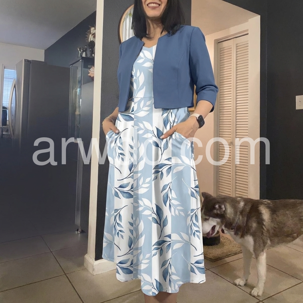 Blue Leaf Print Dress & Cropped Jacket Midi Dress