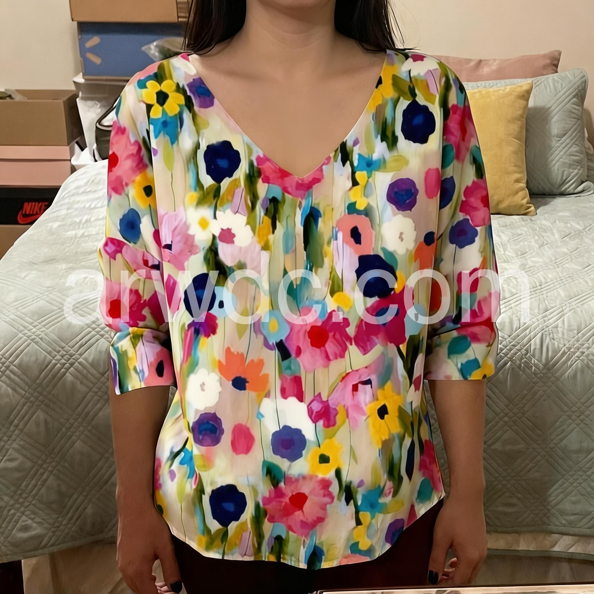 This flowy top features a colorful watercolor floral print on a soft beige base. Deep V-neckline and three-quarter sleeves with rolled cuffs. Lightweight fabric perfect for warm weather. Ideal for casual wear or beach outings. Effortlessly stylish and full of summer spirit.