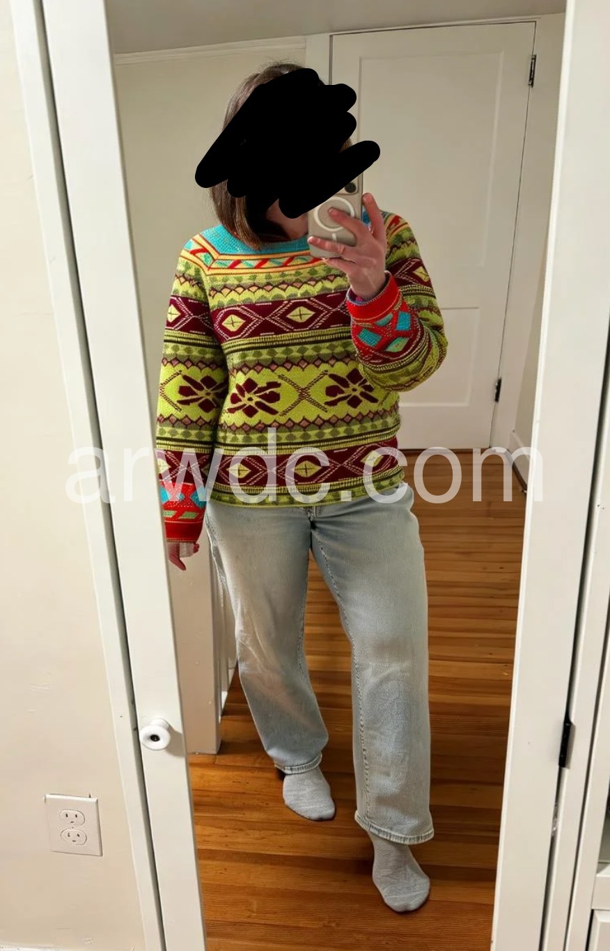 Steal the spotlight in this unique sweater knit in bright shades and a bold stripy pattern. The cozy style has a relaxed fit and pulls on with a wide neckline that shows off your collarbone. Style it with faded straight-leg jeans and combat boots for a 90s-vibe look.