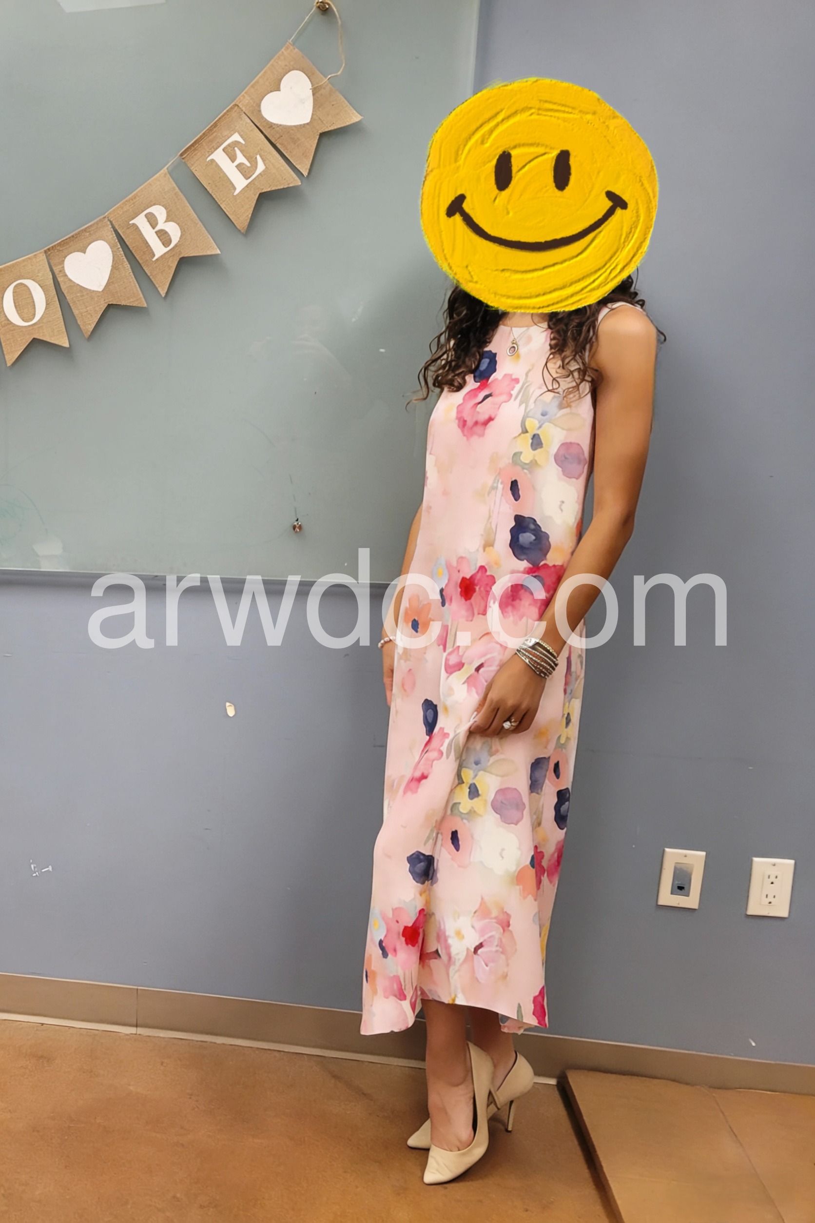 This sleeveless midi dress features a soft pink base with vibrant watercolor floral prints. The round neckline and flowy silhouette create a feminine look. Perfect for summer outings or resort wear. Lightweight fabric for comfort and ease. Ideal for casual elegance by the pool or beach.