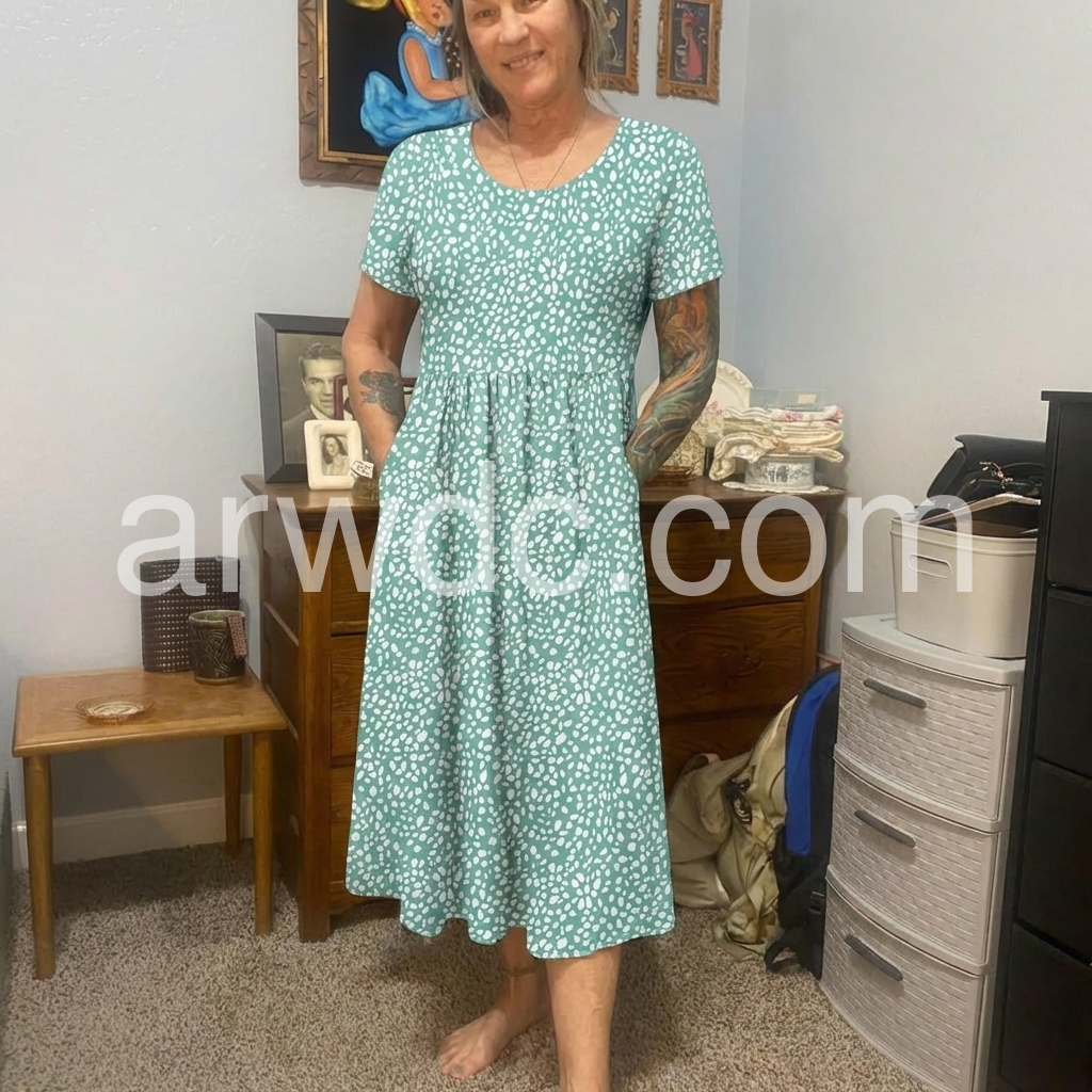 The round neck, flowy A-line fit, and pockets create a comfortable, flattering silhouette, perfect for everyday wear and casual outings.