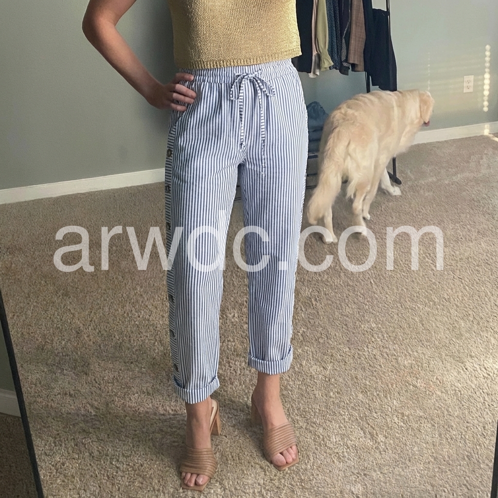These are my new favorite summer pants! The material is so lightweight and breathable, perfect for hot days. I love the blue and white stripes, and the buttons down the side add such a cute, unique touch. The elastic waist is super comfortable. Highly recommend!