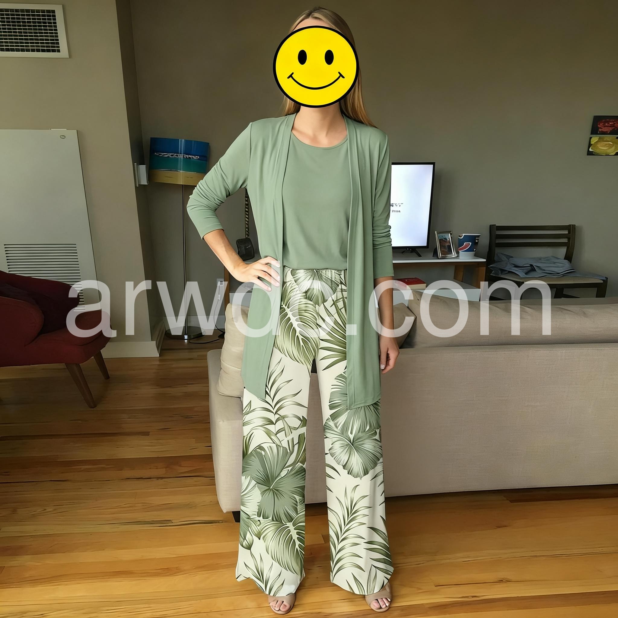 This three-piece set features a soft sage green drape cardigan with a relaxed fit. Paired with wide-leg pants in a leafy tropical print for a fresh, nature-inspired look. Lightweight fabric ensures comfort and breathability. Ideal for casual outings or warm-weather days. Effortlessly chic with a touch of boho elegance.