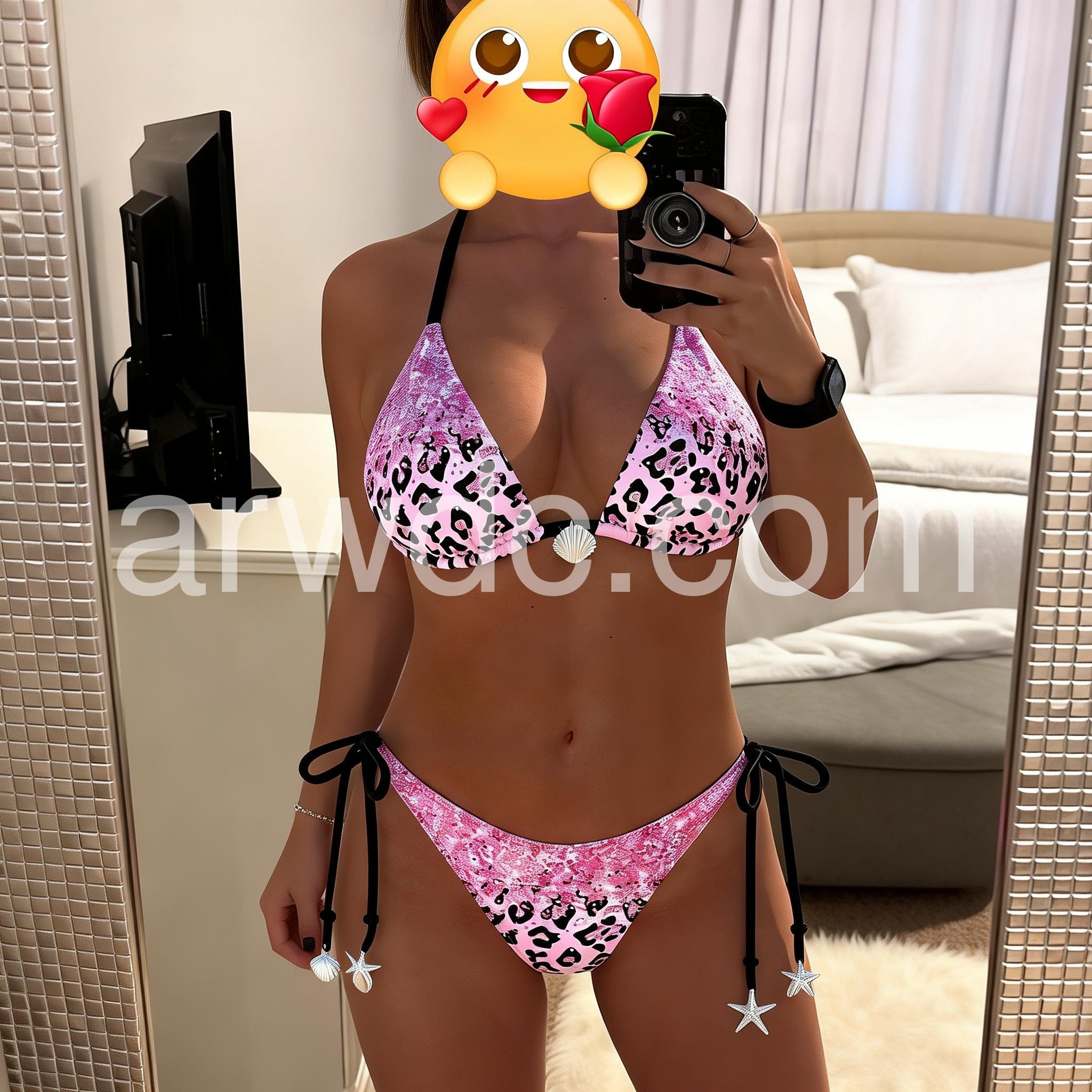This bikini is perfect for a tropical vacation! The pink leopard and glitter design is so fun and vibrant, and it looks even better in person than in the photos. The adjustable straps and ties mean it fits my body perfectly, and the fabric is lightweight and breathable, which is great for hot weather. The shell and star charms are a cute little extra that makes this swimsuit feel unique. I’ll be wearing this all summer long!