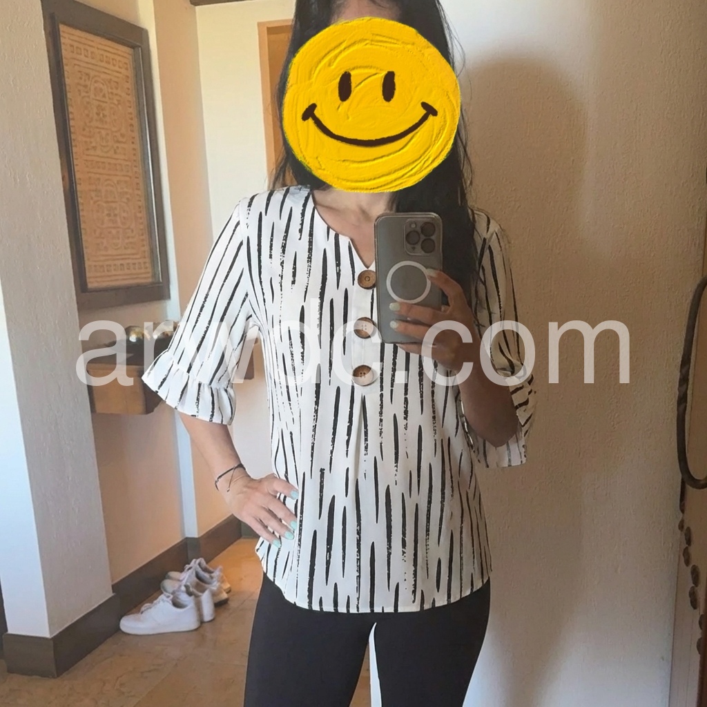 This loose-fitting top features a bold black abstract stripe print on white. V-neckline with wooden buttons down the front. Three-quarter sleeves with ruffled cuffs for a feminine touch. Lightweight and breathable, perfect for casual wear. Easy to pair with jeans or pants.