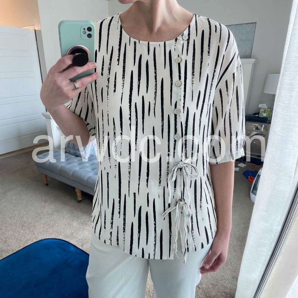 This relaxed-fit blouse features a bold black abstract stripe print on a white base. Round neckline with front button closure and side tie details. Lightweight fabric perfect for everyday wear. Ideal for pairing with jeans or leggings.
