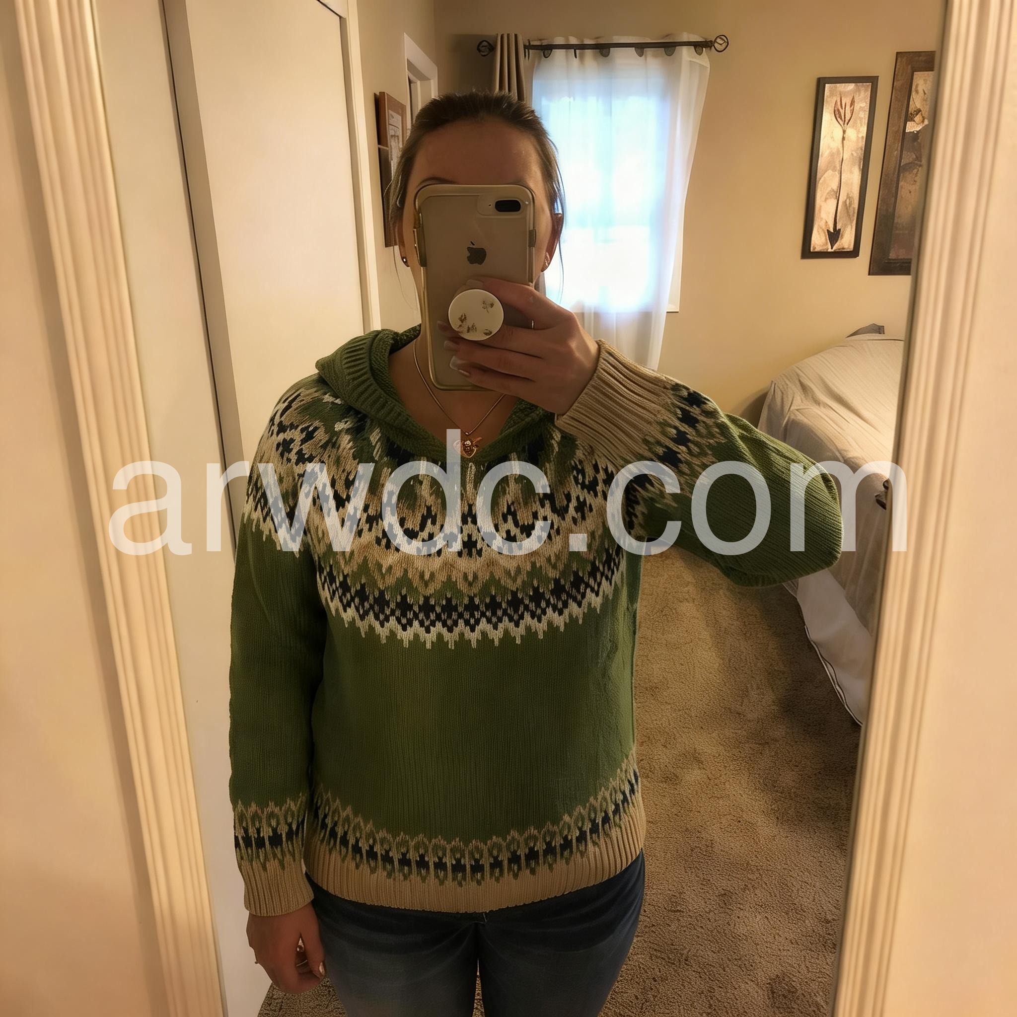 Beautiful sweater! Perfect thickness and does not stretch out of shape. The sleeves are also the perfect length. I usually wear a medium so I got a medium. Very cute and comfortable! I always hang to dry and have had no problems.