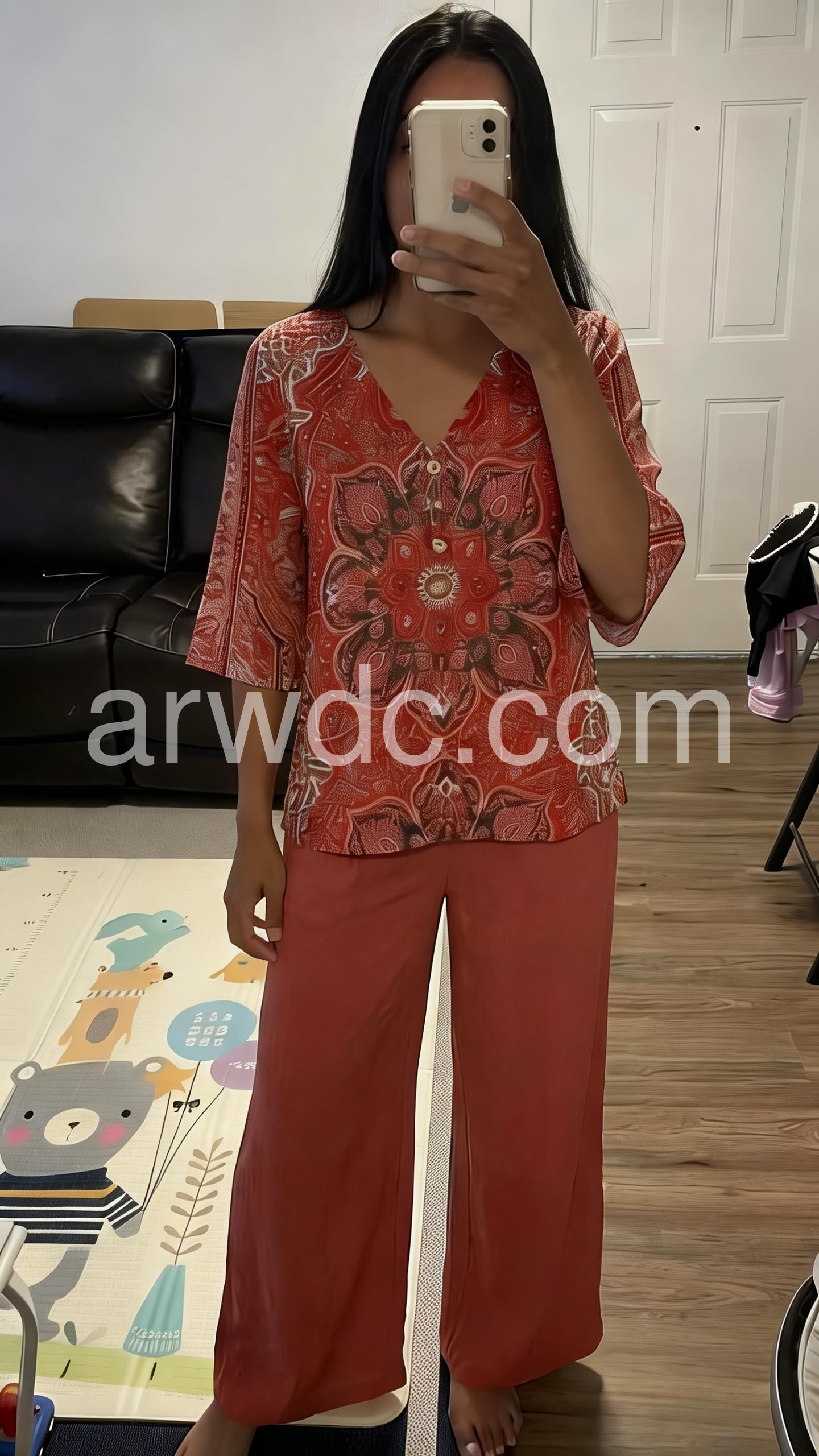 This coordinated set features a V-neck top with a bold mandala print and matching solid wide-leg pants. The relaxed fit ensures all-day comfort. Soft fabric perfect for warm weather. Ideal for casual outings or stylish days out. Effortlessly chic with a bohemian flair.