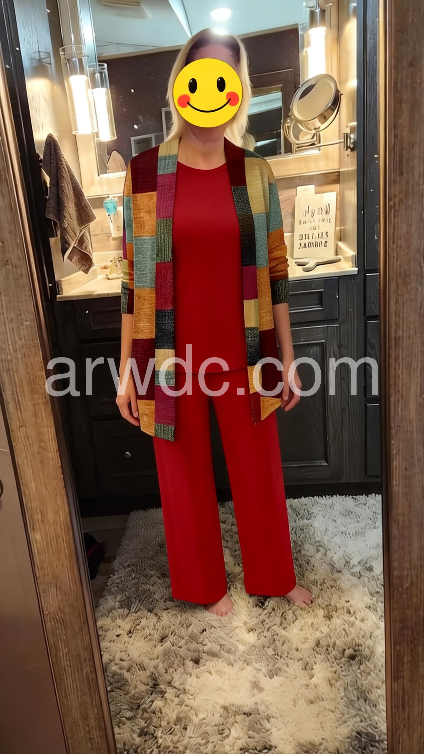 This coordinated outfit features a solid red top and wide-leg pants paired with a vibrant patchwork cardigan. The colorful, geometric design adds a modern touch. Comfortable and chic for casual or semi-formal wear. Perfect for autumn days or stylish outings. Effortlessly elegant with a pop of personality.