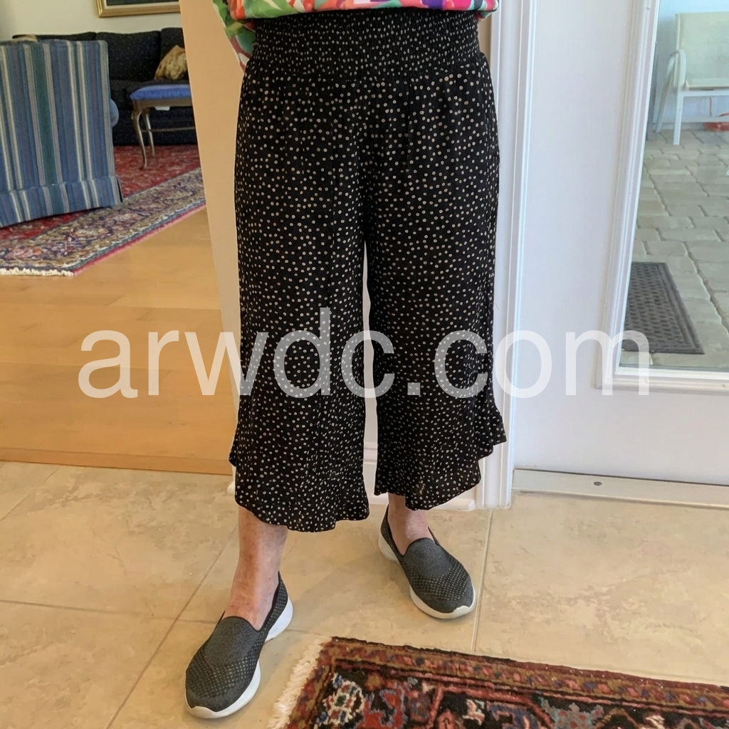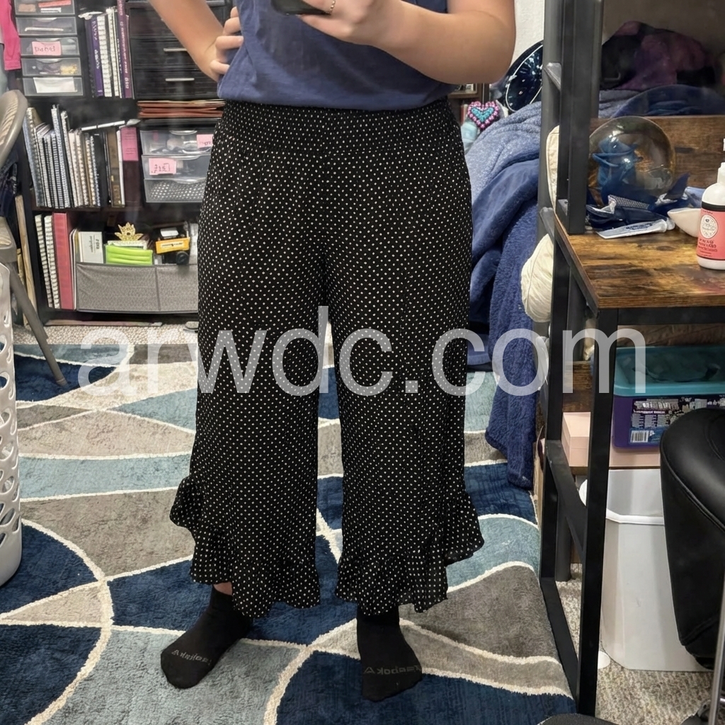 These high-waisted culottes feature a black base with tiny white polka dots. Wide-leg design with ruffled hem for a soft, flared look. Lightweight fabric perfect for warm weather. Ideal for casual outings or relaxed styles. Comfortable and effortlessly chic.