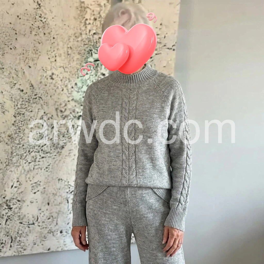 This is such a comfortable knit set. The sweater is cozy and the high neck cable pattern is beautiful. The matching pants fit nicely and feel smooth and soft. I’ve worn it around the house and also for running errands always looks great. It matches the listing pictures perfectly and I’m very happy with it.