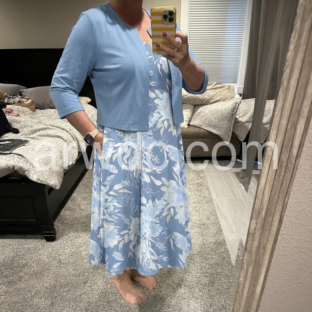 This dress features a flowing midi length with soft blue floral print. Paired with a matching short sleeve jacket for a polished look. V-neckline and side pockets add comfort and style. Lightweight fabric perfect for warm days. Ideal for casual outings or garden events.
