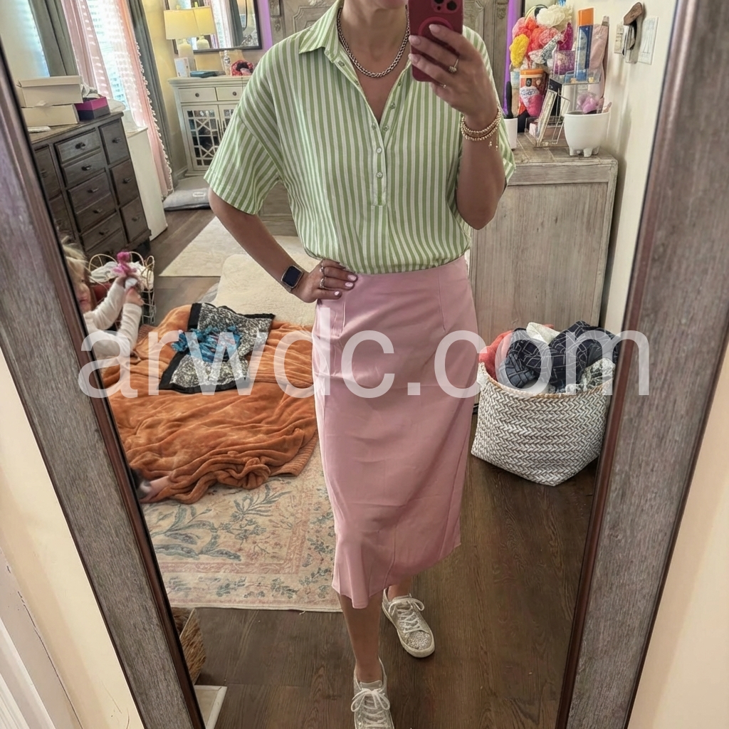 This blouse reimagines classic stripes with a modern, relaxed silhouette. The fresh green-and-white vertical print evokes timeless, preppy style.