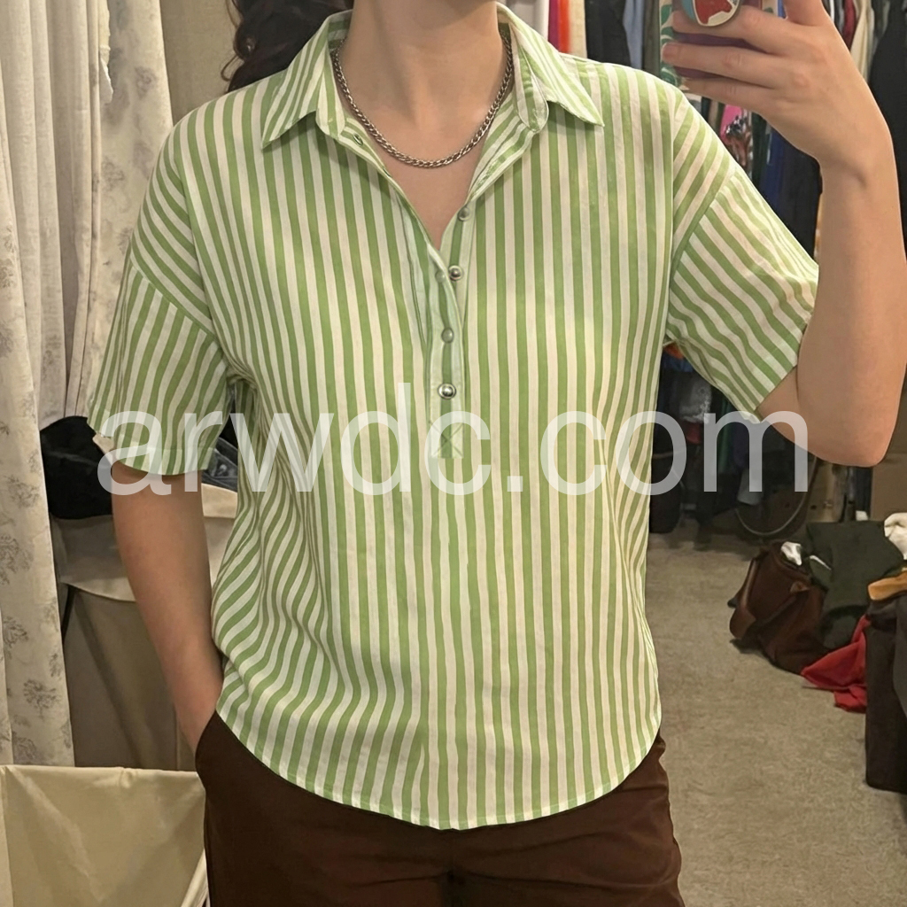 Green White Stripe Collared Half Placket Blouse