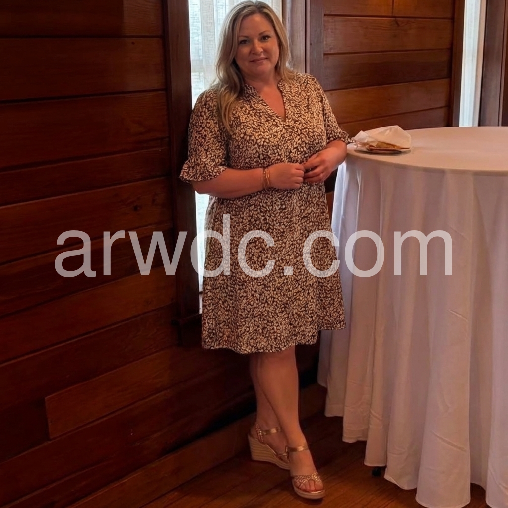 Bought this for a weekend brunch and got so many compliments. It is easy to dress up with heels and a clutch like the model, or down with flat sandals. Very forgiving around the midsection.