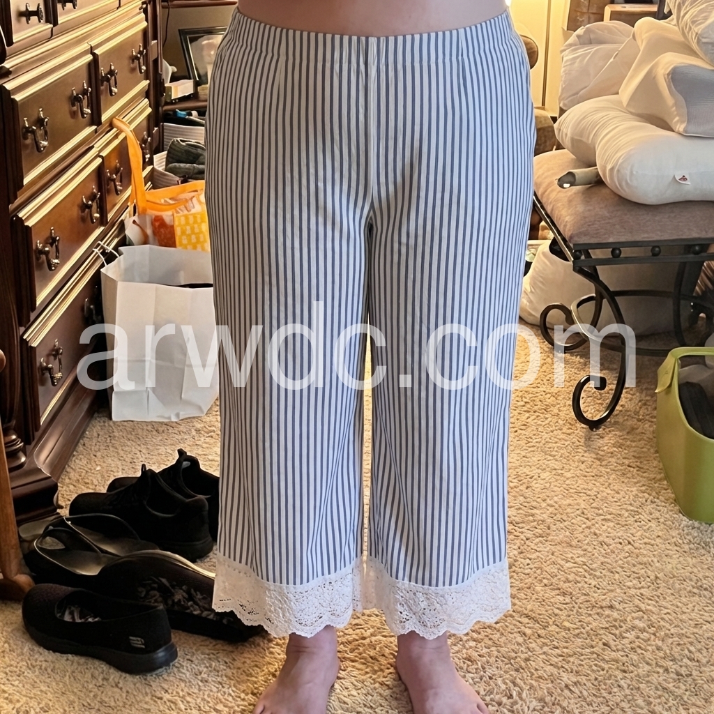 These relaxed-fit pants feature vertical blue and white stripes with a delicate lace trim at the hem. Elastic waistband and side pockets for comfort. Lightweight fabric perfect for warm weather. Ideal for beach days or casual outings. Effortlessly stylish and breezy.