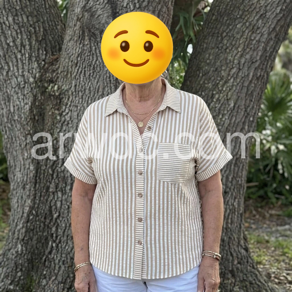 This short-sleeve shirt features vertical brown and white stripes with a classic collar. Front button closure and chest pocket add practical style. Soft, lightweight fabric for all-day comfort. Perfect for casual wear or layering. Effortlessly chic and easy to pair.