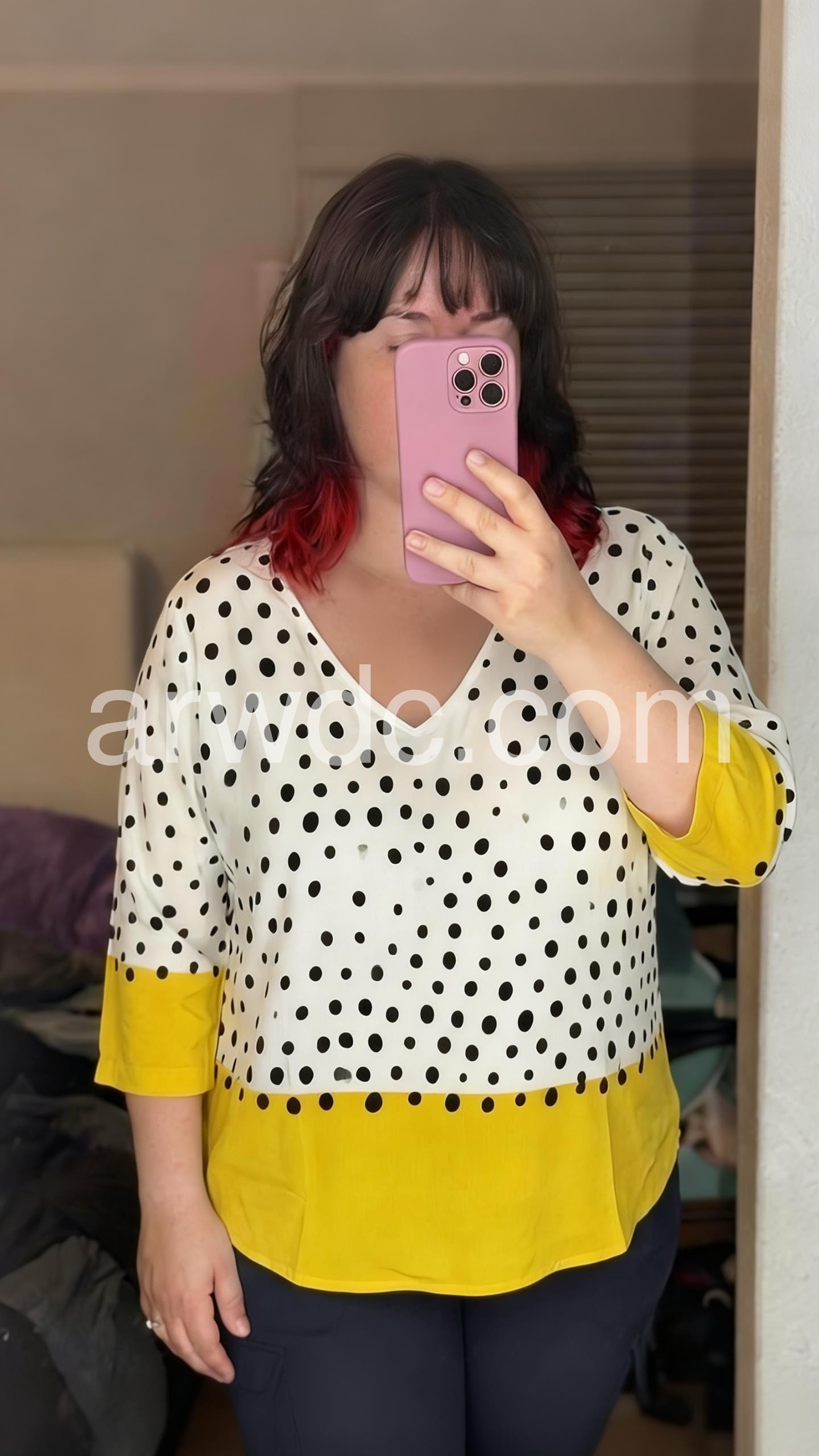 This relaxed-fit top features a white base with black polka dots and a vibrant yellow hem. V-neckline and three-quarter sleeves with rolled cuffs. Lightweight fabric for comfort and style. Perfect for casual wear or adding a pop of color to your outfit. Effortlessly trendy and easy to pair.