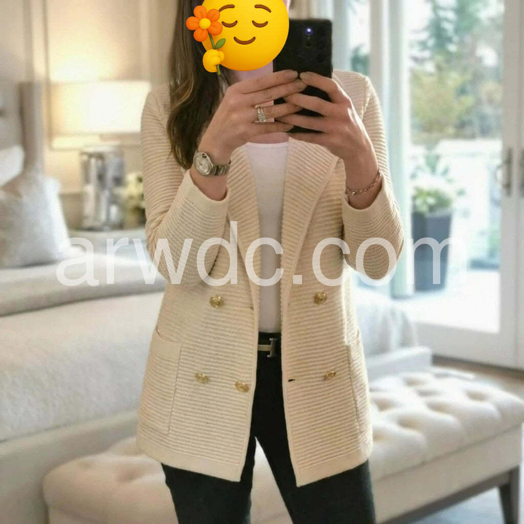 The ribbed texture is gorgeous and makes it look much more expensive than it is. The gold buttons add such a classy touch. Fit is true to size and very flattering.