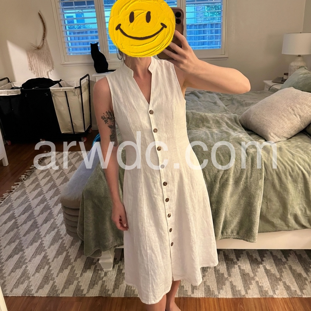 I am so impressed with the quality of this dress for the price. The contrast of the dark brown buttons against the crisp white fabric is stunning. It has a beautiful A-line shape that flows nicely when you walk. True to size, definitely check the size chart!
